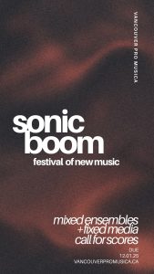 Vancouver Pro Musica is pleased to invite all BC composers to submit new works for our 2026 Sonic Boom Festival of New Music: Mixed Ensembles & Fixed Media Concerts. Selected works will be presented as part of the 2026 Sonic Boom Festival of New Music running March 20 and 21, 2026. Please click HERE to be directed to the full details of the call.